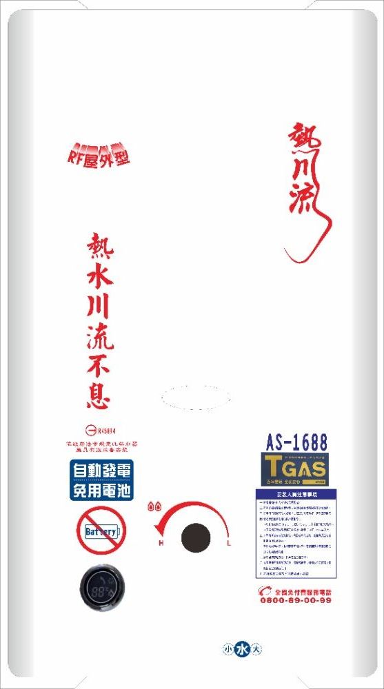 16公升屋外抗風型自然排氣熱水器免用電池AS-1688 $16,000加入訂單
